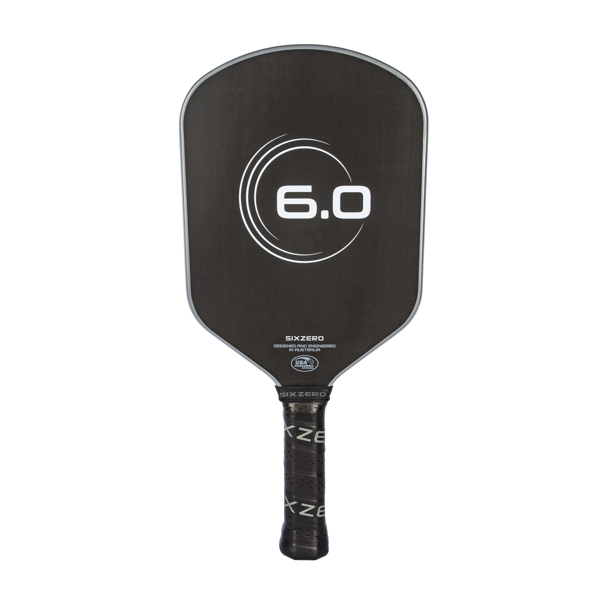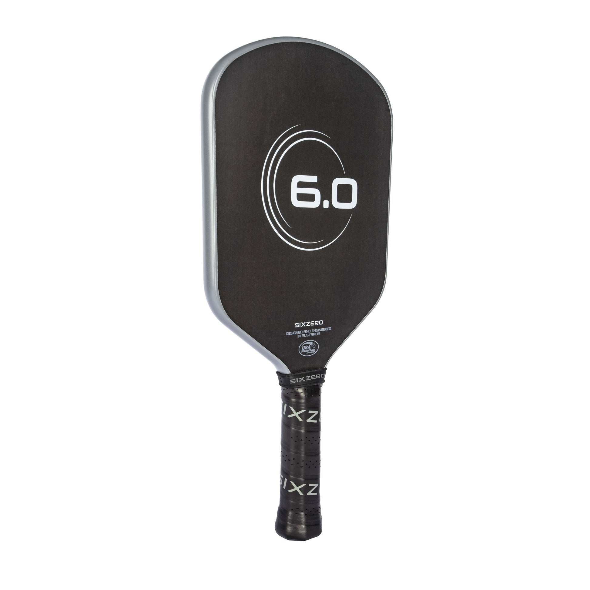The elongated 3D carbon thermoformed handle is tailored to reduce vibration and increase comfort. The carbon face and fusion edge technology span the entire length of the handle, melded under intense heat and pressure to ensure strength and durability. The ergonomic design is perfected with a premium custom Six Zero perforated leather grip, making it suitable for all hand sizes and particularly beneficial for players with a double backhand.